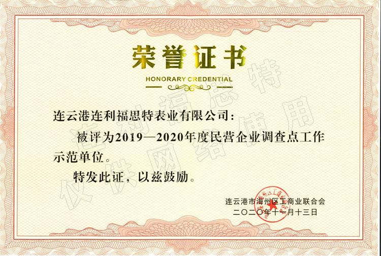 近日,連云港連利福思特表業(yè)有限公司榮獲“2019-2020年度民營企業(yè)調(diào)查點(diǎn)工作示范單位”稱號。 民營企...